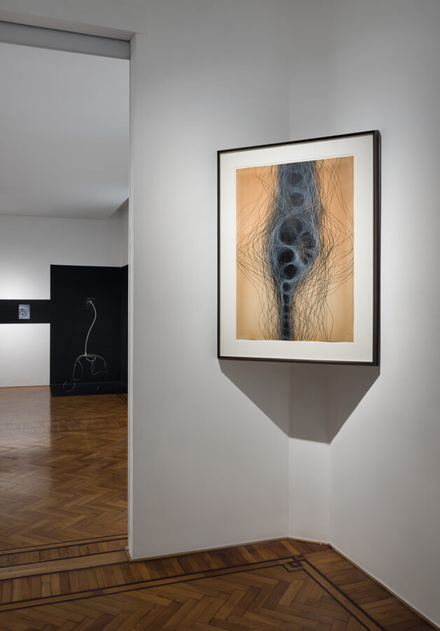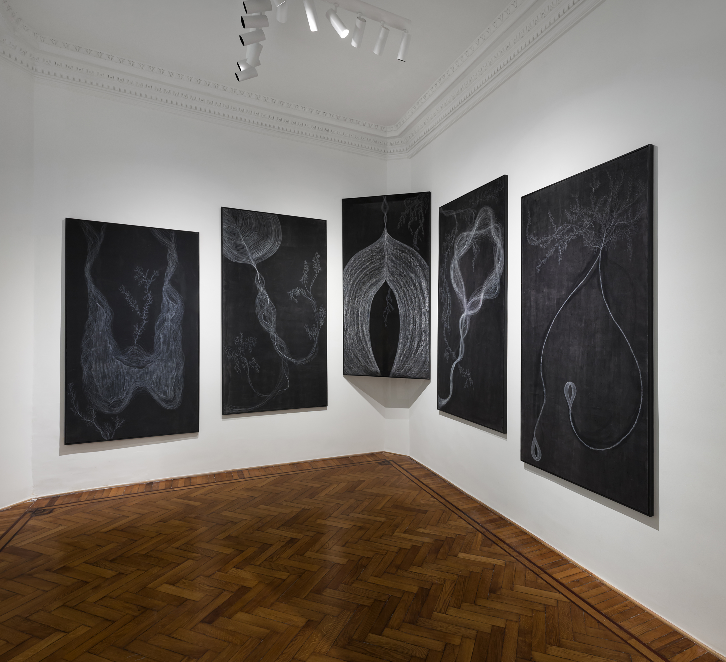Las obras revelan la búsqueda de una semiótica sensorial propia: una escritura visual cuyos grafemas son células, filamentos, redes neuronales y formas orgánicas. Más que representar ideas, estas formas funcionan como sistemas abiertos donde la línea y la materia conectan escalas —de lo celular a lo cósmico— y despliegan relaciones entre cuerpo, pensamiento y materia.