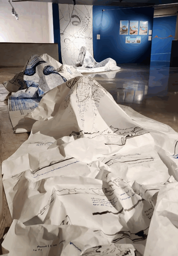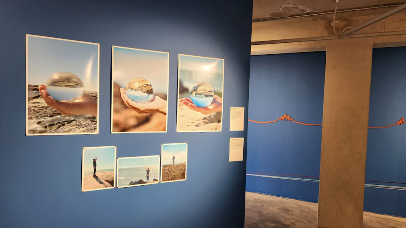 La muestra reúne distintos formatos de obra que dialogan entre sí: instalaciones escultóricas, fotografías, piezas sonoras, dibujos y archivos cartográficos, y ediciones y objetos. Entre ellas se destacan instalaciones realizadas con piedras, tierras y hielo; series fotográficas que trabajan el horizonte como punto de contacto entre costas africanas y sudamericanas; obras sonoras que registran el “latido” de la tierra; dibujos basados en mapas históricos y vitrinas con materiales de archivo; y ediciones artesanales que amplían la noción de circulación y deriva.